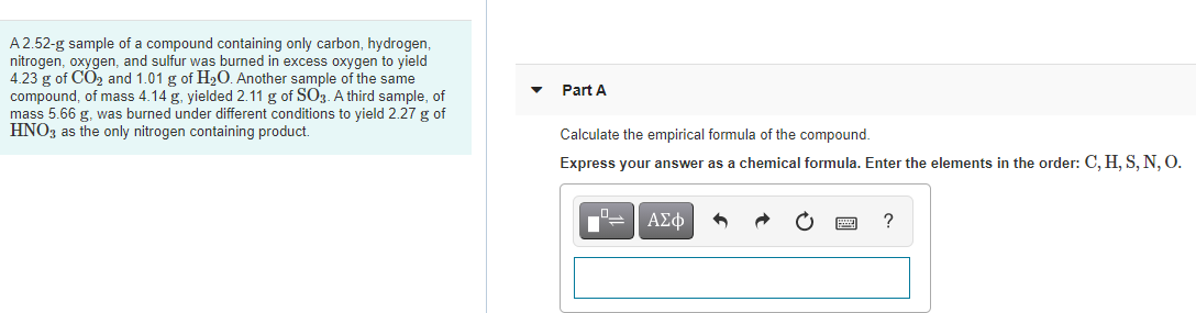 Calculate the empirical formula of the compound. Another sample of the same compound of mass 414 g yielded 211 g of SO3 as the only sulfur containing product. A third sample of mass 566 g was burned under different conditions to yield 227 g of hno3 as the only nitrogen.